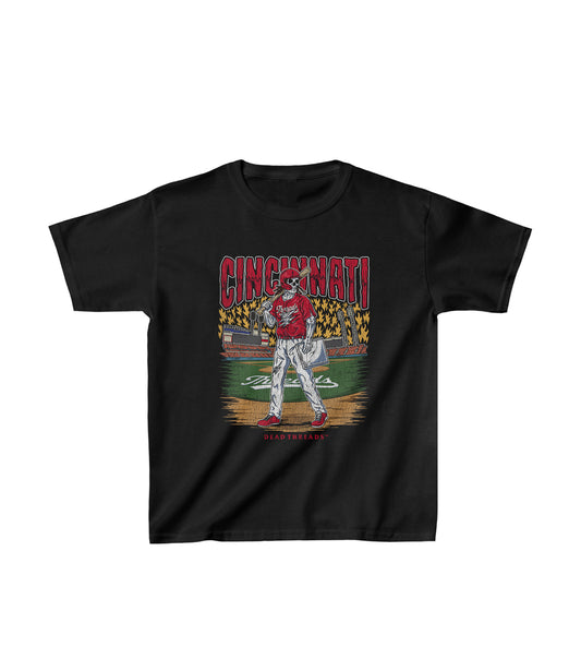 Hand-drawn skeleton merch for all true Cincinnati baseball fans.