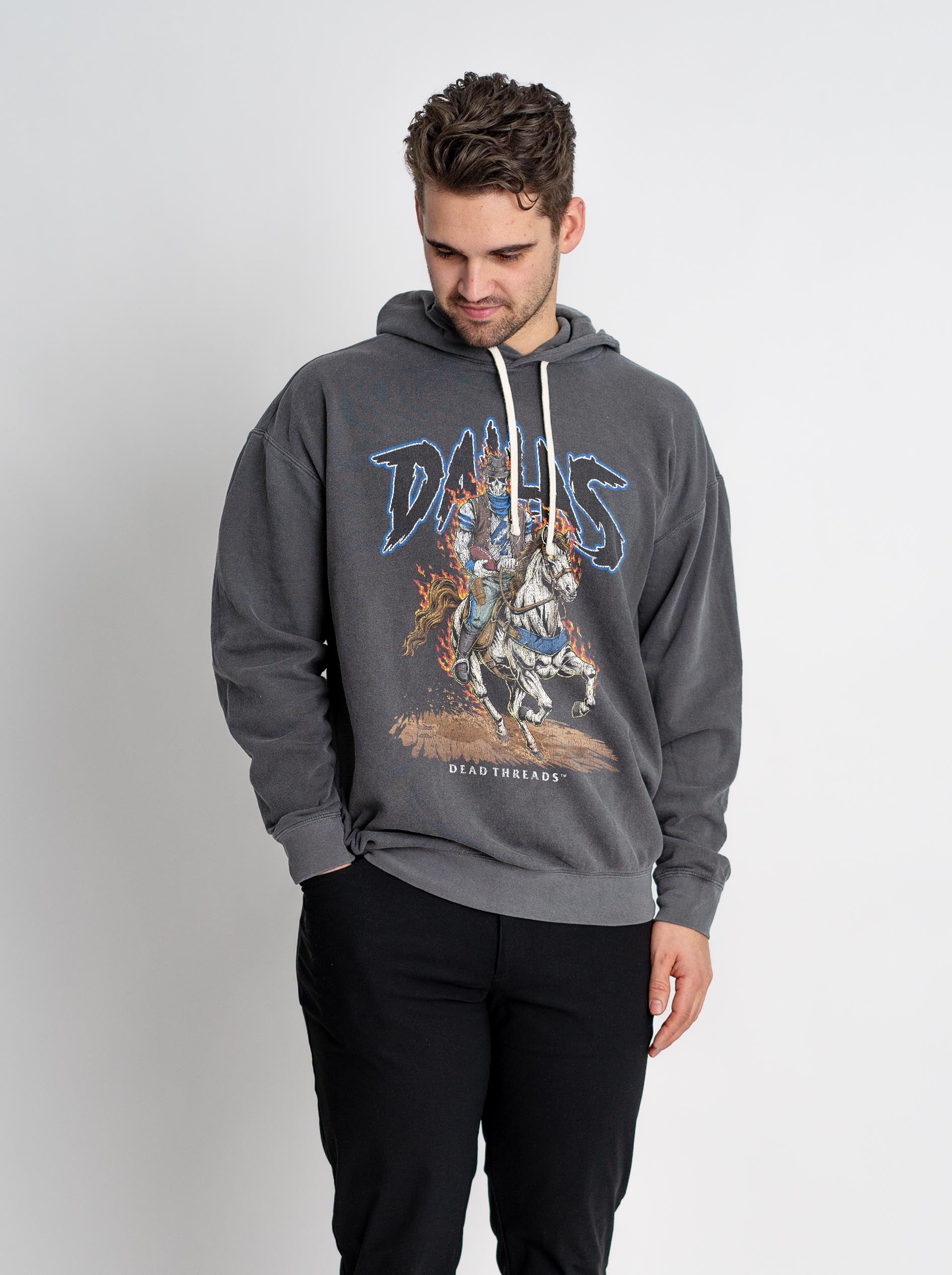THE FIT: Our latest addition to the shop, this badass 100% cotton lightweight hoodie is the perfect warm-but-not-too-warm piece for when you want to rep your team on your chest, but also keep your ears warm. Truthfully, these are seasonless. They’re true to size with a relaxed fit (not athletic, not boxy) and are garment-dyed, which just means they look and feel vintage straight off the rack. All DT designs feature our signature “plastisol” effect, which is an ultra-precise, subtle “cracking” effect incorporated into the print. You won’t get print quality like this on Et*y.