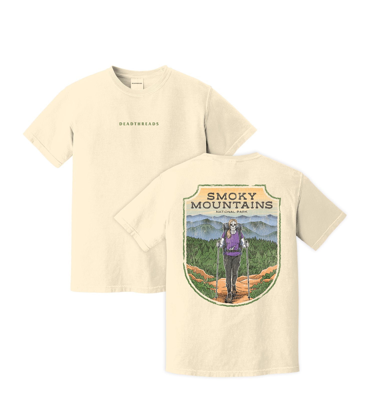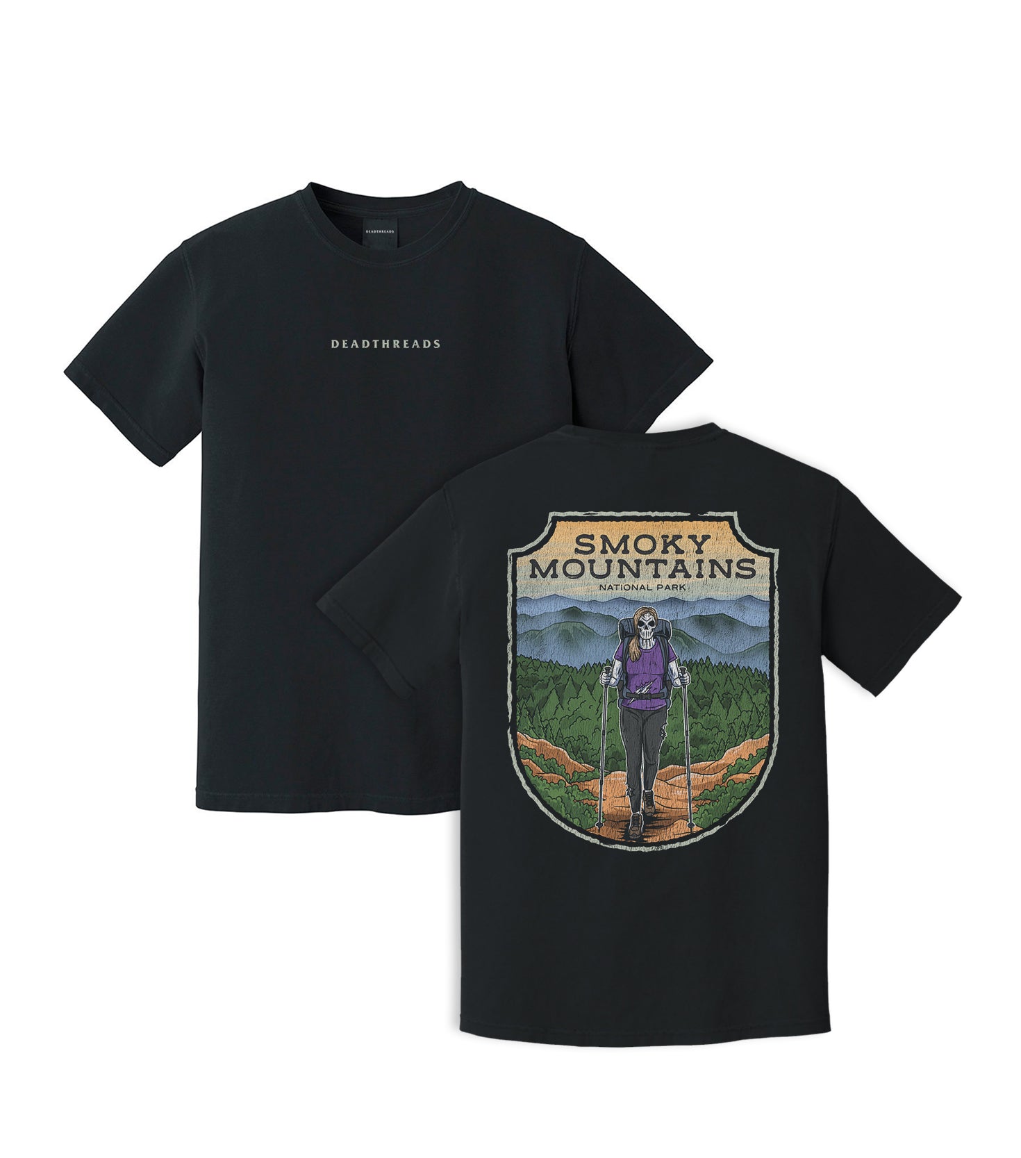 Rep the outdoors with style. Our all-new designs feature the “Dead Threads” logo on the front for a clean, minimal look, and our bold skeleton x National Parks artwork on the back for maximum impact. From the trail to the city, this combo delivers a unique edge—subtle in the front, statement in the back. And when the weather drops, our premium hoodies bring the same adventurous style with added warmth and comfort.